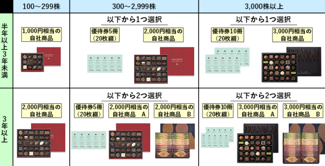 | 100株以上 | 選択不可 | 2000円相当1点 (選択不可) |