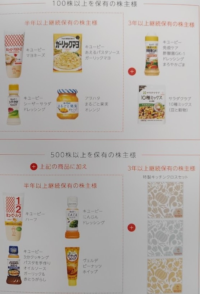 キユーピー株主優待内容(保有株数・継続保有年数別)