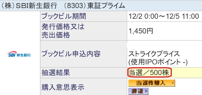 SBI新生銀行IPO(落選)