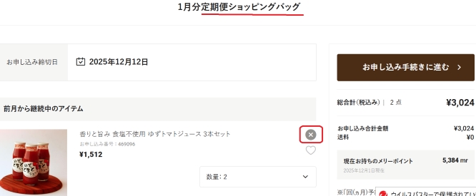 - 「©定期便マーク」の商品から選択して「ショッピングバッグに入れる」。